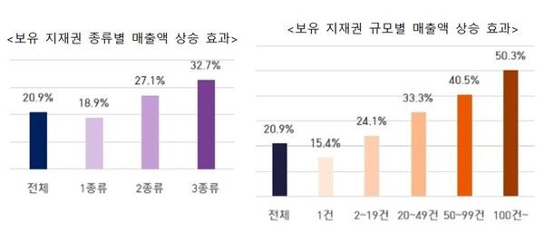 지재권을 얼마나 많이 보유하고 있는지도 기업 매출 실적에 미치는 영향이 컸다. 지재권을 1건만 보유한 기업은 미보유 기업에 비해 종업원 1인당 매출액이 15.4% 높았다.