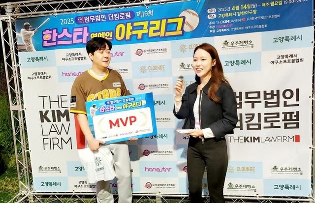 개그맨 이성배(왼쪽)가 지난 19일 고양시 장항야구장에서 열린 더킴로펌배 제19회 한스타 연예인 야구리그 스타즈와 P.O.M의 경기에서 투타에 걸쳐 맹활약해 MVP를 수상했다. 오른쪽은 인터뷰를 진행 중인 이혜원 아나운서. / 한스타미디어 제공
