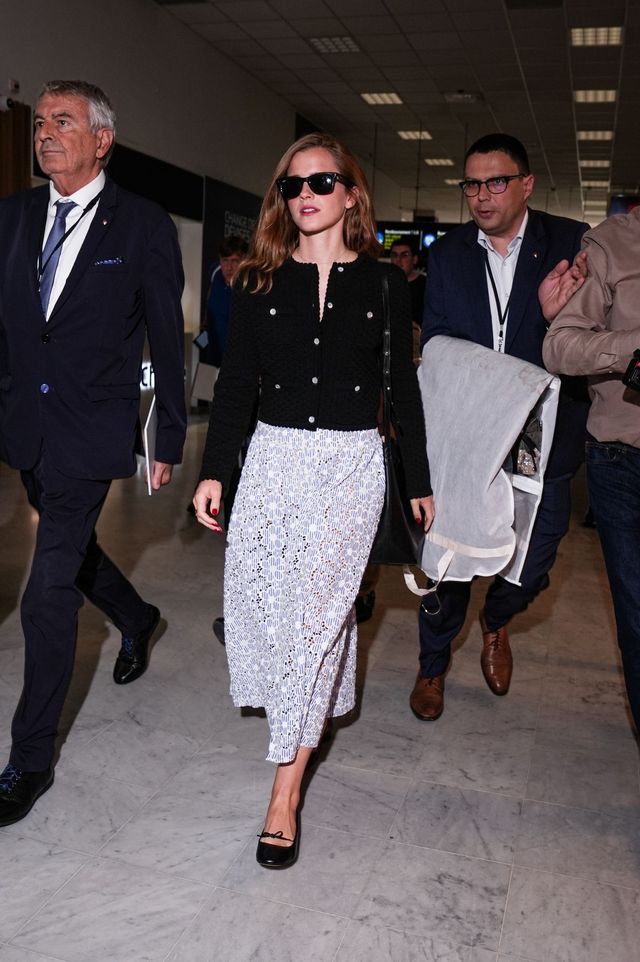 엠마 왓슨이 선택한 룩은 봄에 딱 어울리는 클래식한 조합인데요. 단정하지만 디테일이 귀여운 검은색 카디건에 하늘하늘한 화이트 레이스 맥시스커트를 매치했죠. 여기에 레이밴 선글라스와 크로스백, 발레 슈즈를 더하며 꾸안꾸 공항 룩의 정석을 완성했어요. 공항뿐 아니라 일상에서도 활용해봐도 좋겠죠.