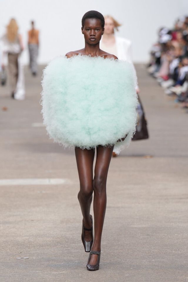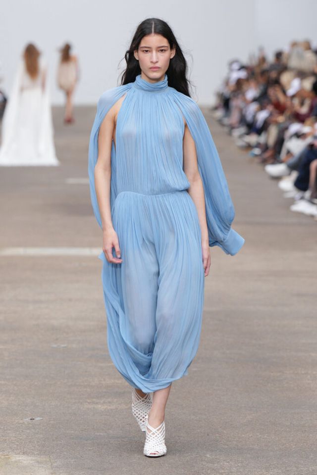 NOTE “당신이 사랑하는 것을 지키세요(Save What You Love).” 나지막하게 들리는 배우 헬렌 미렌의 내레이션으로 쇼가 시작됐다. 이번 시즌 지속 가능성을 추구하는 스텔라 매카트니의 시선은 새의 깃털 보호로 향했다. 작가이자 조류 관찰자인 조너선 프랜즌(Jonathan Franzen)의 책 에서 영감을 받아 새를 보호하자는 의미를 담아 컬렉션을 구성했다. 메시 보디수트 가슴 부분에 종이접기로 장식한 실크 비둘기 모티프와 전자와 의료 폐기물을 재활용해 만든 비둘기 조각 등 새 모티프를 곳곳에 표현해 컬렉션의 주제를 강조했다.