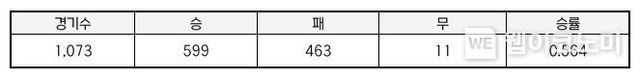 염경엽 감독은 5월 20일(화) 기준, 총 1,073경기에서 599승, 463패, 11무, 승률 0.564을 기록하고 있다.