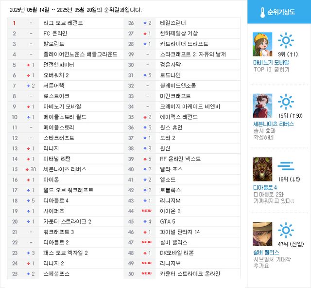 이번 주 중위권에서는 디아블로 4가 5계단 하락한 18위에 그쳤다. 디아블로 4는 잔 4월 30일부터 시즌 8에 돌입했고, 직전 시즌과 비교하면 내림세는 비슷하다. 다만 디아블로 4보다 약 한 달 전에 신규 래더를 시작한 디아블로 2가 22위를 굳건히 지키고 있어 두 게임 간 격차가 빠르게 좁혀지고 있다는 점이 포인트다. 지난 시즌에 이어 이번에도 디아블로 2가 디아블로 4를 제치는 상황이 벌어질 것이냐에 관심이 집중된다.