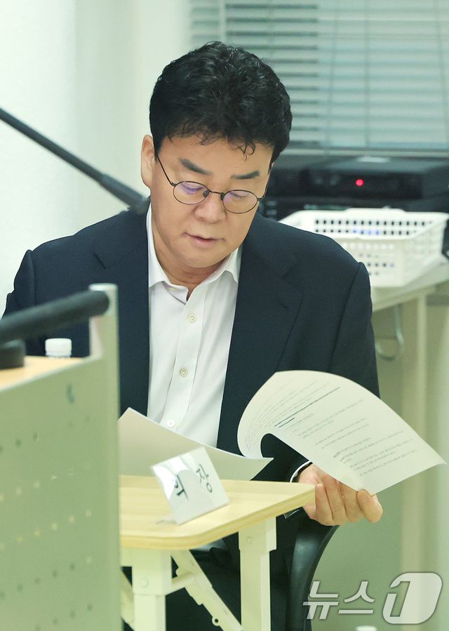 백종원 더본코리아 대표가 3월28일 서울 서초구 스페이스쉐어 강남역센터에서 열린 정기 주주총회에서 참석해 자료를 보고 있다. 2025.3.28/뉴스1