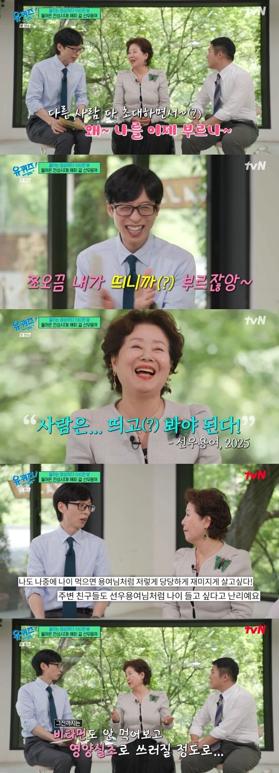 선우용여는 "유튜브에서 떴다고 해서 그런 거에 대해 프라우드 하거나 이러지 않는다. 애당초 결혼하면서 TV에 나오는 건 직업이다"라며 덧붙였고, 유재석은 "댓글에 그런 댓글이 많다. 나도 선우용여 선생님처럼 나이 들고 싶다고"라며 거들었다.
