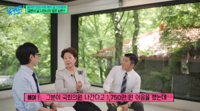 이날 선우용여는 “처음 결혼은 신랑이 안 나타났다. 우리 남편이 18살에 아버지를 잃었다. 그래서 사돈 되는 분을 아버지처럼 여겼다. 그분이 국회의원 선거에 나온다고 어음을 1750만 원을 했는데 남편이 대신 갚기로 했었다”며 “그런데 돈을 못 갚아서 결혼식 날에 경찰서에 잡혀갔다”고 회상했다.