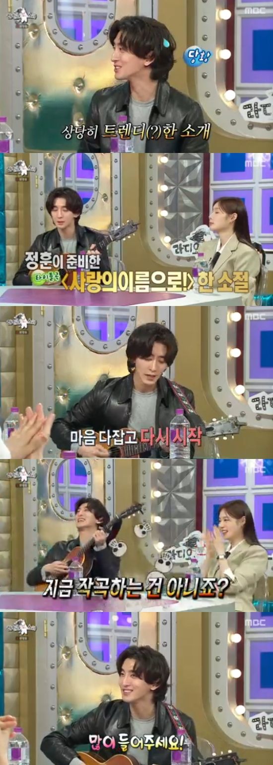 최정훈은 '사랑의 이름으로'를 한소절 불러주겠다고 노래를 시작했지만, 여러 번 실수를 하면서 노래를 이어가지 못했다. 이런 최정훈의 모습에 "실수하는 척하면서 계속 홍보를 하네요? 지금 작곡하는 건 아니죠?"라고 웃음을 자아냈다.