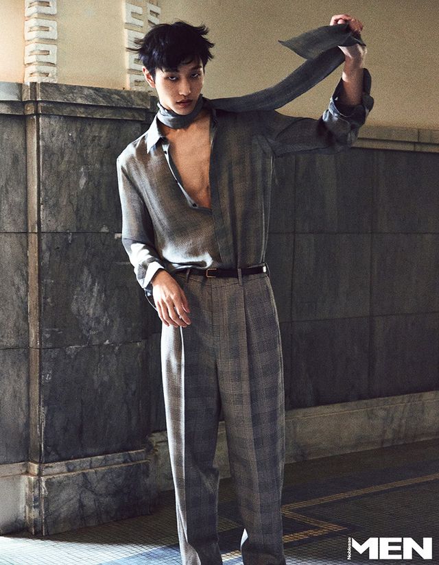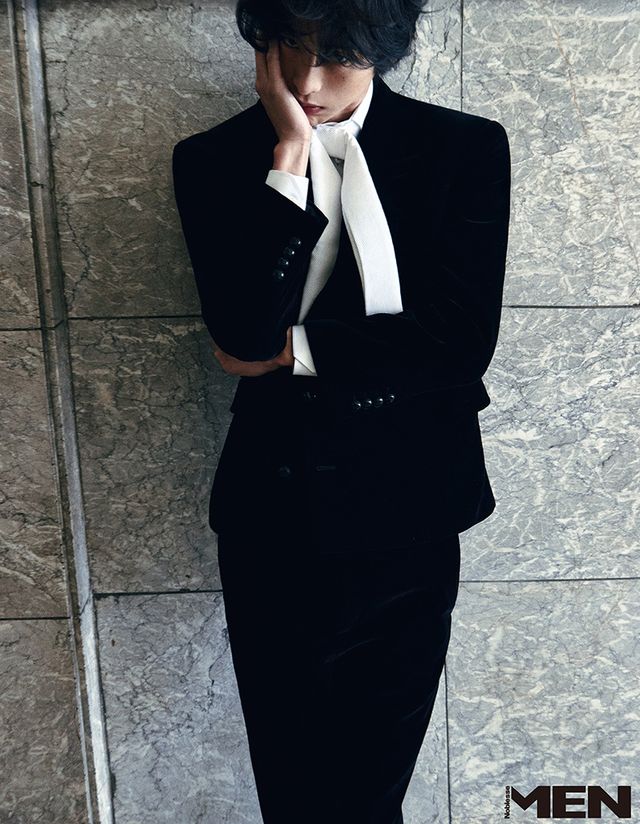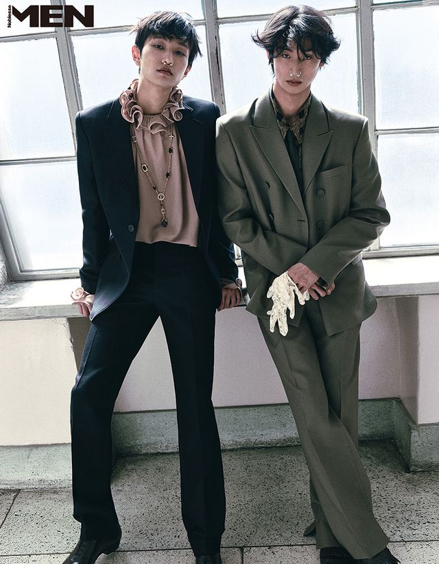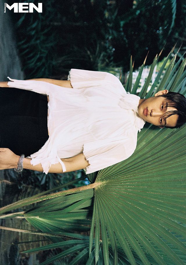 현준 _ 블랙 슈트 Loewe, 러플 장식 블라우스 YCH, 브라운 옥스퍼드 슈즈 Celine Homme, 롱 네크리스 Louis Vuitton, 노즈 링 Valentino Garavani.