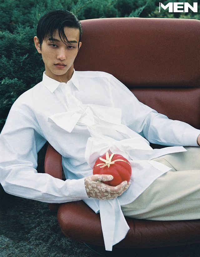 매듭 장식 셔츠 Comme des Garçons Homme Plus, 화이트 팬츠 Celine Homme, 토마토 체인 백 Loewe, 레이스 장갑 Valentino Garavani.