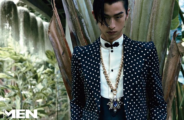 유고 _ 더블 슈트와 홀스빗 패턴 타이 모두 Gucci, 지오메트릭 패턴 셔츠 Recto, 손에 들고 있는 플라워 레이스 장갑과 노즈 링 모두 Valentino Garavani, 프린지 장식 몽크 스트랩 슈즈 Prada.