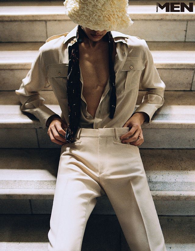 견장 장식 실크 셔츠와 팬츠 모두 Tom Ford, 플라워 클로슈 해트 Loro Piana, 스카프로 연출한 타이 Bottega Veneta.