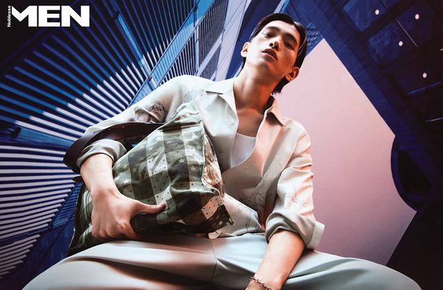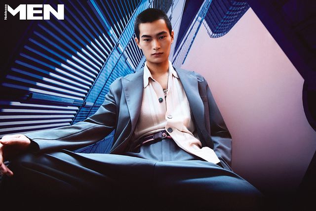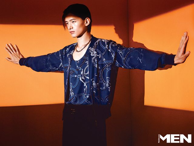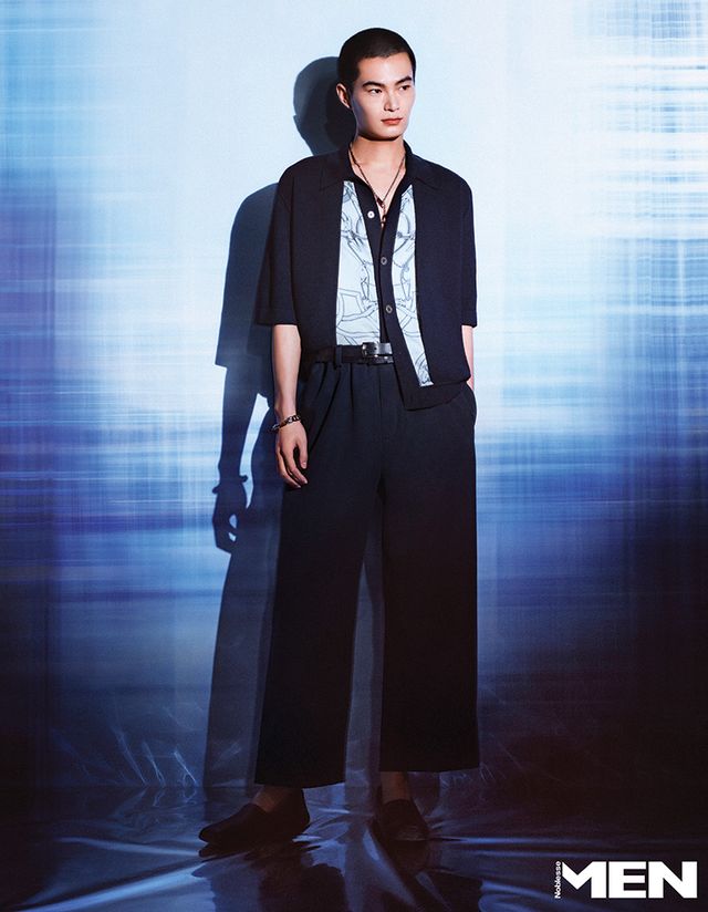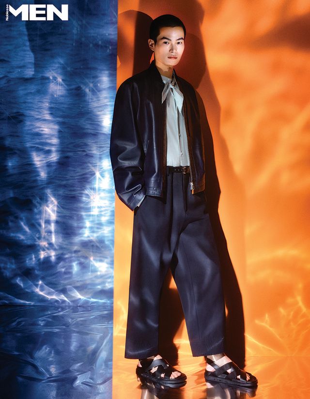 송아지 가죽 블루종과 스카프 장식 셔츠, 네이비 팬츠, 더블 버클 벨트, H 모티브 송아지 가죽 샌들 모두 Herme`s.