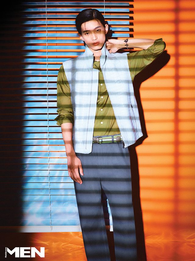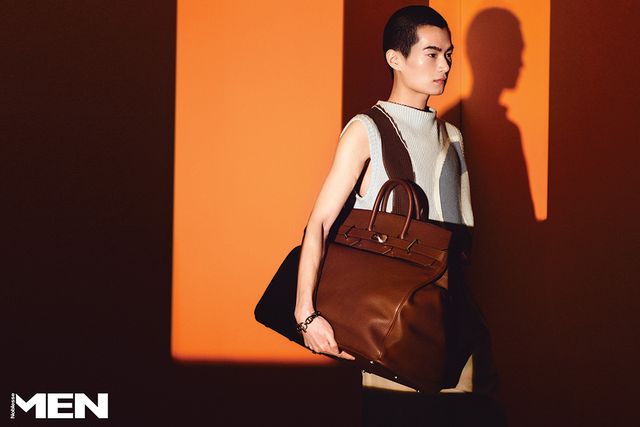 누벅 송아지 가죽 셔츠와 민소매 톱, 연회색 팬츠, 깅엄 체크 패턴 캔버스 소재의 에트리비에 백, 체인 팔찌 모두 Herme`s.