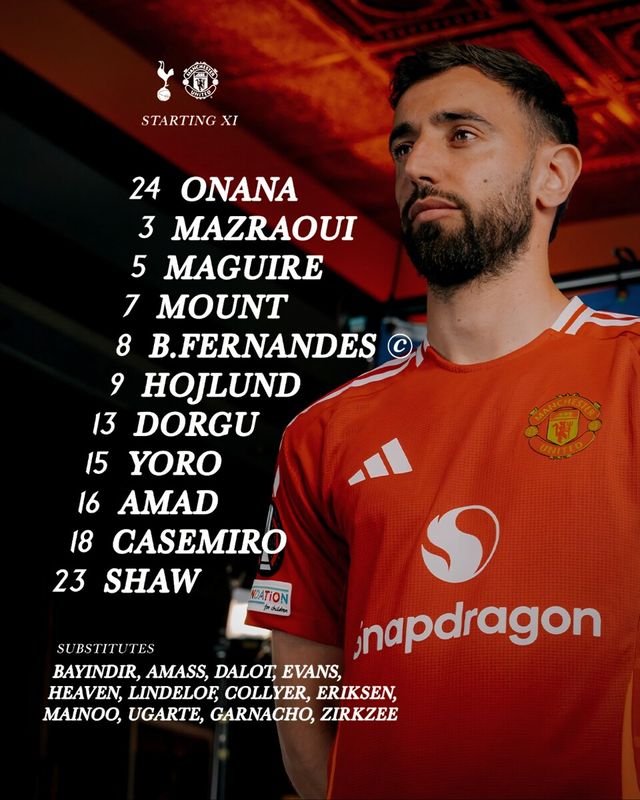 후벵 아모링 감독이 이끄는 맨유는 3-4-3으로 맞선다. 라스무스 호일룬과 메이슨 마운트, 아마드 디알로가 상대 골문을 정조준한다. 중원은 파트리크 도르구, 브루누 페르난드스, 카세미루, 누사이르 마즈라위가 출전한다. 수비진은 루크 쇼, 해리 매과이어, 레니 요로로 구축했고, 골문은 안드레 오나나가 지킨다.