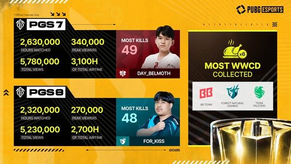 가장 많은 치킨을 획득한 팀은 BB팀(BB Team), 팀 팔콘스(Team Falcons), 포레스트 네추럴 게이밍(Forest Natural Gaming)팀이 각각 6번의 치킨을 획득한 팀이 됐다. 최다 킬을 기록한 선수는 PGS 7의 데이트레이드 게이밍(Daytrade Gaming) 소속 벨모스(Belmoth) 선수로 49킬을, PGS 8에서는 포레스트 네추럴 게이밍(Forest Natural Gaming)의 키스(KISS) 선수가 48킬을 기록하며, 각각의 대회에서 최고 수준의 경기력을 증명했다.