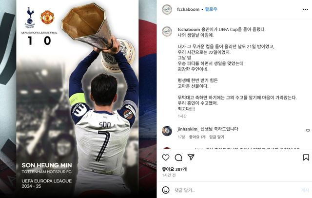 차범근 이사장은 22일 오후(한국시간) 차범근 축구교실의 공식 인스타그램 계정을 통해 "흥민이가 나의 생일날 아침에 UEFA Cup을 들어 올렸다. 내가 그 무거운 컵을 들어 올리던 날도 21일 밤이었고 우리 시간으로는 22일이었지"라고 글을 올렸다.