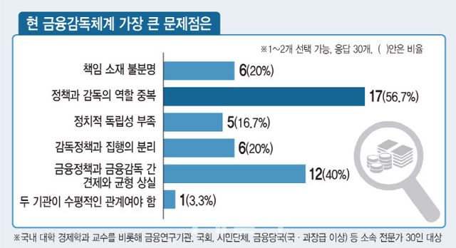 이데일리가 국내 대학 경제학과 교수와 금융당국 관계자 등 소속 전문가 30인을 대상으로 한 설문 조사에서도 현 체계의 가장 큰 문제점으로 응답자의 56.7%가 ‘역할 중복’, 40%가 ‘견제와 균형 상실’을 꼽았다. ‘정치적 독립성 부족’을 꼽은 비율도 16.7%였다. 응답자들은 “금융위와 금감원의 역할·기능이 중첩돼 정책 혼선이 자주 보인다” “감독 당국의 정책 시그널이 일치해야 금융시장 안정이 보장될 수 있다”고 지적했다. 실제 이복현 현 금감원장 체제에서도 상급기관인 금융위와 엇박자를 낸다는 논란은 끊이지 않았다.