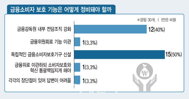 다만 금융 소비자 보호 기능 정비에 대해서는 의견이 갈렸다. “독립적인 기구로 신설해야 한다”는 응답이 50%로 가장 높았지만 “금감원 내부 전담조직을 강화해야 한다”는 응답도 40%나 됐다. 민주당에선 금감원을 가칭 금융감독위원회와 금융소비자보호원으로 나누는 방안도 논의되고 있지만 최근 민주당 10대 정책 공약에 정부조직 개편 내용이 담기진 않았다. 우선순위가 높진 않다는 의미로도 해석된다.