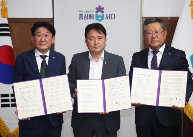 | ▲ 민간협력 재난예방 업무협약(왼쪽부터 대한건설협회충북도회 유정선 회장, 김영환 지사, 대한전문건설협회충북도회 류근형 회장) |