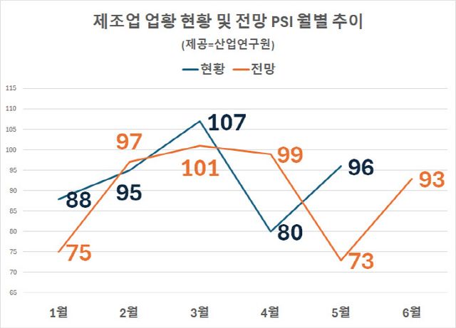 산업연구원이 이달 주요 제조업 전문가를 대상으로 월별 제조업 업황 설문조사를 진행한 결과 6월 전망 설문조사지수(PSI)가 전월 73에서 93으로 큰 폭 반등했다.