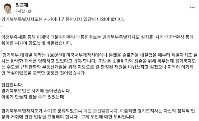 22일 임근재 전 경기도경제과학진흥원 상임이사는 자신의 사회관계망서비스(SNS)에 “경기북부특별자치도는 사기이니 김동연 지사 입장이 나와야 한다”고 밝혔다.