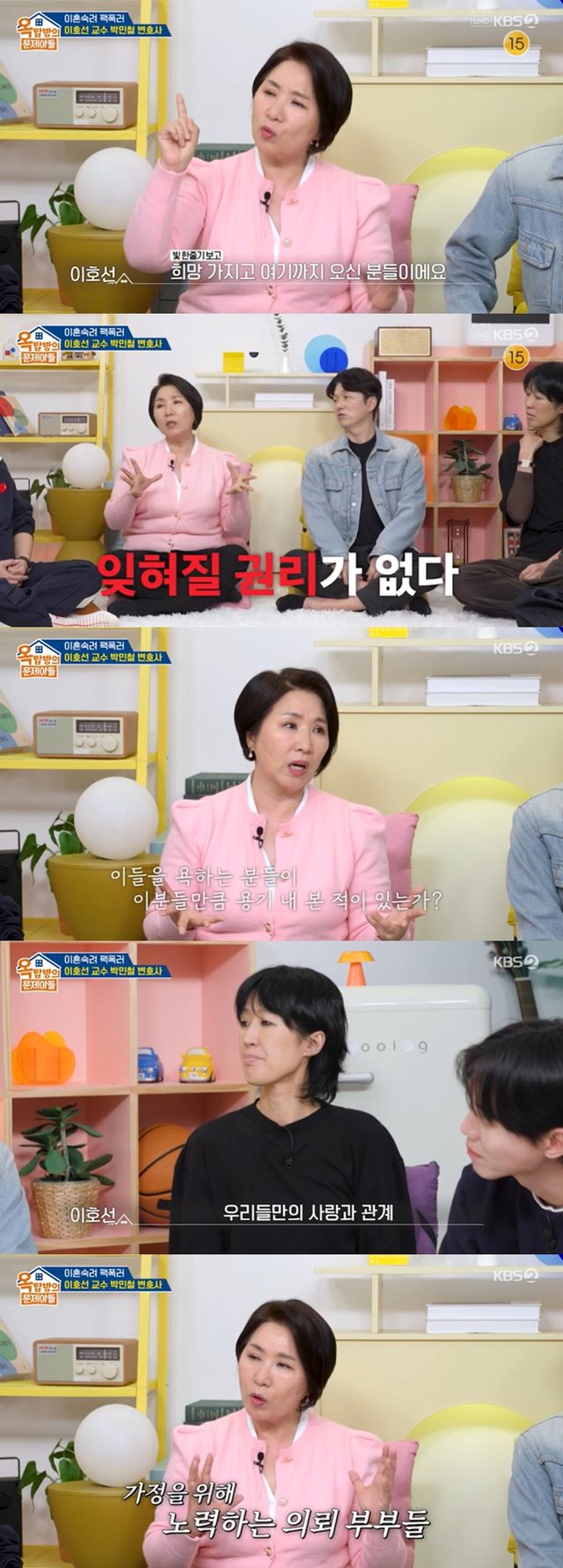 송은이도 출연자들은 박제되는 것이라며 거들었고, 이호선 교수는 "이분들이 용기 낸 것만큼 욕하는 분들이 용기 내본 적이 있는지 묻고 싶다. 우리들의 가정과 사랑을 위해 이 정도로 노력해 본 적이 있는지 물어보고 싶다"라고 말했다.