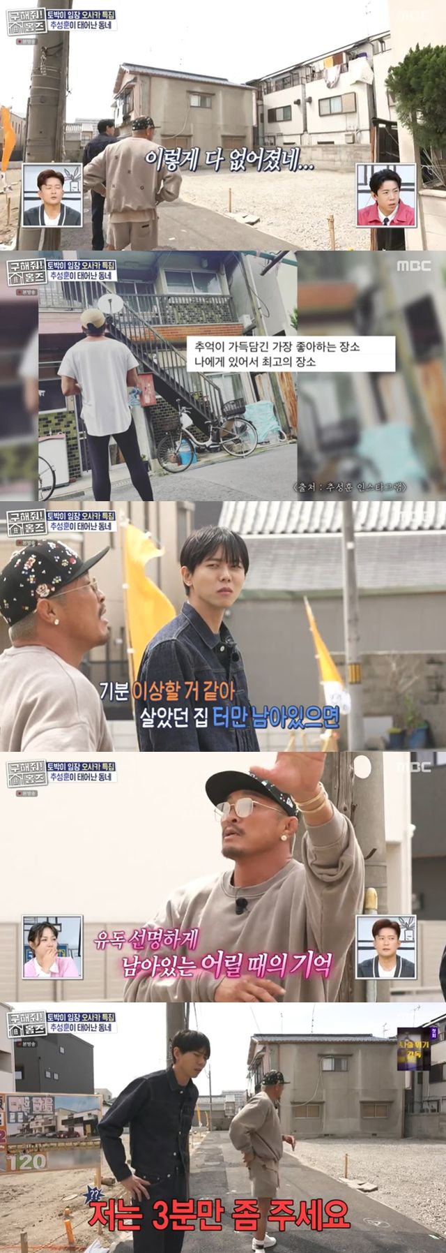 추성훈은 철거가 돼 공터가 된 자신의 집터에 도착했다. 주우재는 "기분 이상할 것 같아. 내가 살았던 집터만 남아있으면"이라고 말했고, 박나래는 "초심으로 돌아갈 곳이 없다는 말이 너무 슬프다"라고 전했다.