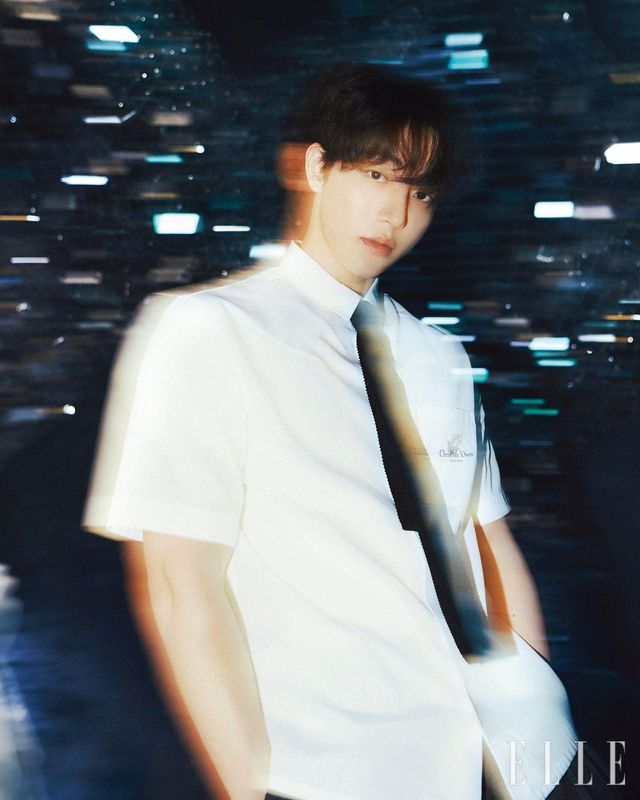한국 아티스트 수 써니 박의 작품으로 화려하게 빛나는 디올 무도회 전시관 속 남주혁이 입은 화이트 반팔 셔츠와 블랙 타이, 블랙 팬츠는 모두 Dior Men.