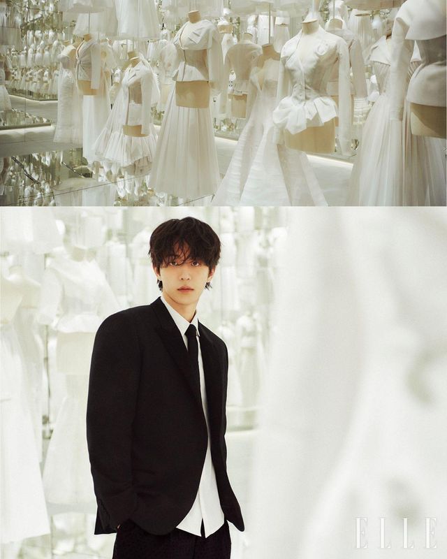 자연을 테마로 한 디올 정원에서 남주혁이 입은 노치 라펠과 패치 포켓 디테일의 알파카 & 버진 울 자카르 그레이 재킷, 화이트 코튼 셔츠, 블랙 팬츠와 실크 니트 타이는 모두 Dior Men.