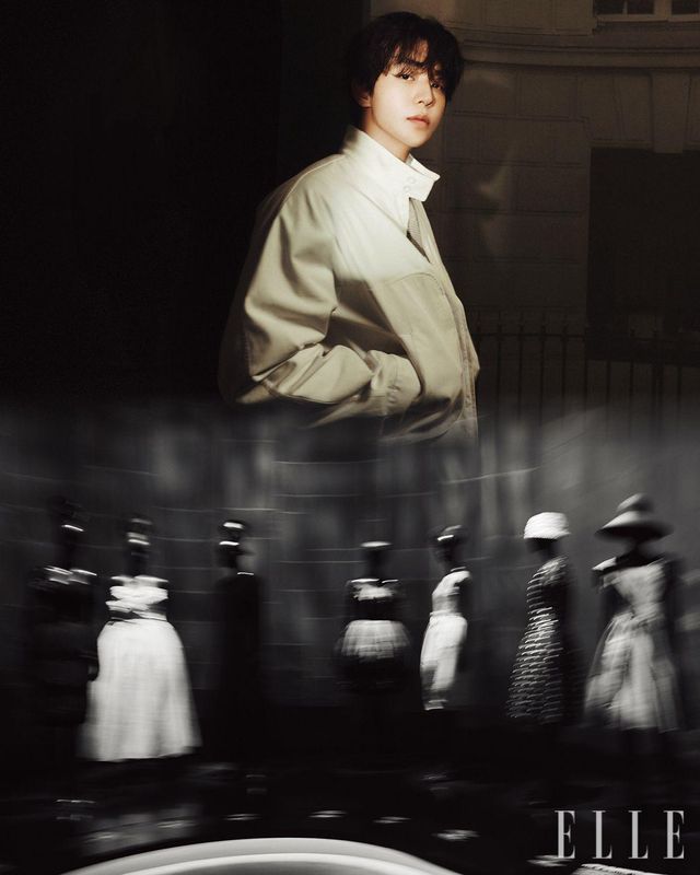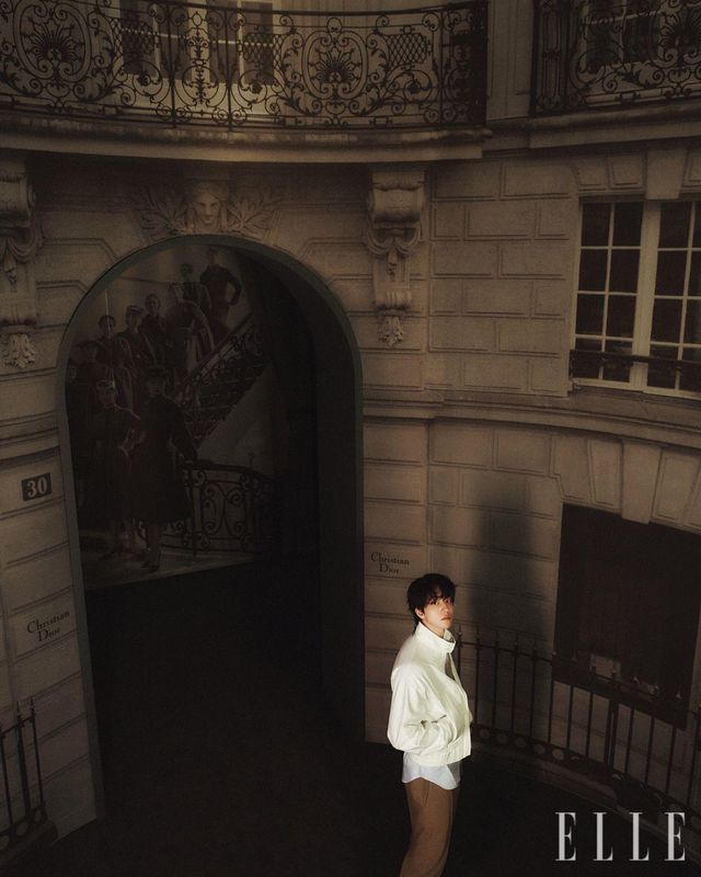 몽테뉴가 30번지를 재현한 공간에서 남주혁이 입은 화이트 코튼 블루종과 블루 스트라이프 셔츠, 베이지 팬츠, 그레이 타이와 테니스 스니커즈는 모두 Dior Men.