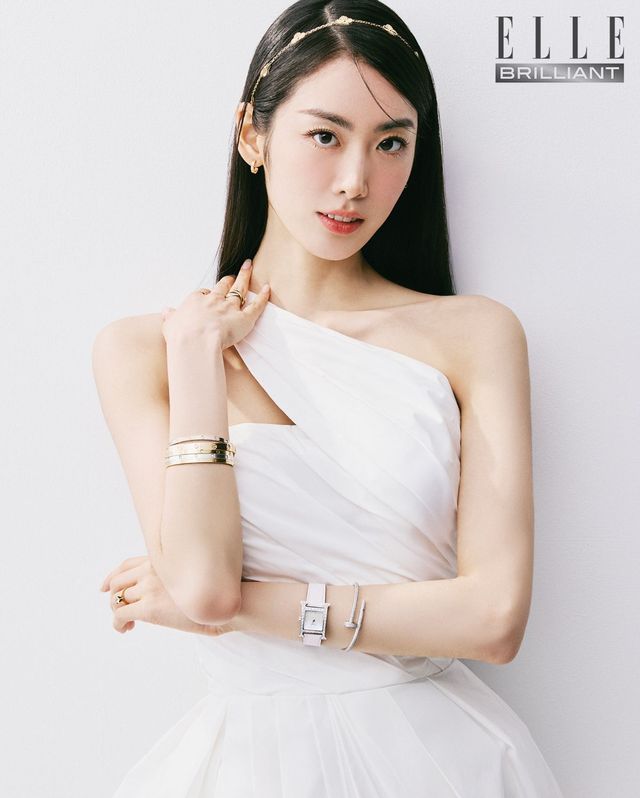 헤어밴드로 연출한 반클리프 아펠 빈티지 알함브라 브레이슬릿과 까르띠에 ‘러브’ 후프 이어링, 오른손 검지에 착용한 까르띠에 ‘러브’ 링, 약지에 착용한 ‘트리니티’ 링, 손목에 레이어드한 까르띠에 ‘러브’ 브레이슬릿, 왼손에 착용한 다이아몬드 골드 링, 에르메스 ‘에이치 아워’ 워치, 까르띠에 ‘저스트 앵 끌루’ 브레이슬릿은 모두 본인 소장품. 화이트 드레스는 Vera Wang by Bridal Kong.