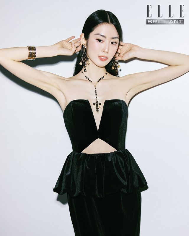 돌체앤가바나 ‘메달 십자가’ 이어링과 ‘트래디션 묵주’ 네크리스, 레이어드한 까르띠에 ‘러브’ 브레이슬릿, 오른손 검지에 착용한 까르띠에 ‘러브’ 링, 약지에 착용한 다이아몬드링, 왼손 검지에 착용한 까르띠에 ‘러브’ 링은 모두 본인 소장품. 벨벳 드레스는 Self-Portrait.