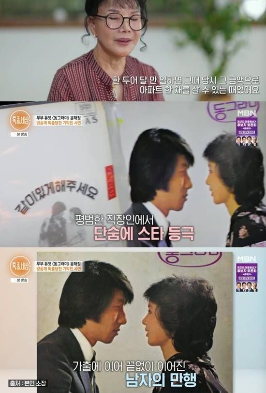 그 이유에 대해 윤해정은 "남편이 제가 노래 부르는 걸 보더니 자신이 무명가수였다고 레코드 만들어보자고 해서 '그대여'를 만들어보게 됐다"라며 부부듀엣 가수의 기로 들어선 계기를 밝혔다. 그러나 그 선택은 얼마 지나지 않아 인생을 송두리째 바꾸어 놓았다고 전했다. 그는 "그 당시에 남편도 젊었던 거다. 그게 노름의 계기가 된 거다. 그런 꼬임에 빠졌었다. 말 들어보니까 그러면 여관방을 전전한다더라. 그런 게 시작이 된 거다. 가출로 인해서 모든 생방송을 펑크를 내게 됐다. 생방송을 펑크 낸다고 하면 퇴출이다"라고 전했다.