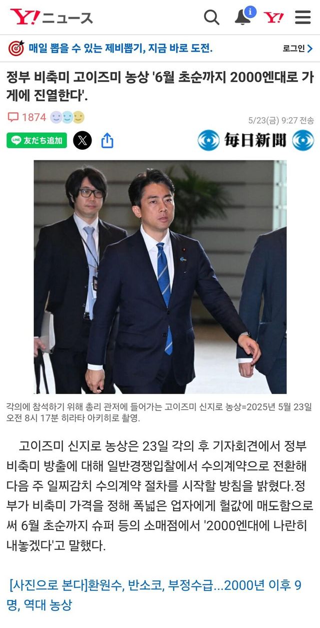 5킬로에 4000엔까지 갔던 쌀이 2000엔대로 진입함너무 순식간에 훅 떨어지니까 입 잘못 놀려서 나락갔던 전 농림수산이 뒤에서 개수작 부리느라 쌀값 못 잡았던거 아니냐는 말이 좀 나옴ㅋㅋ