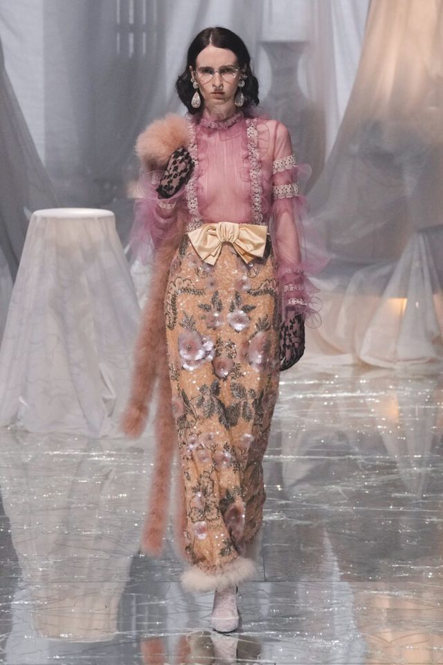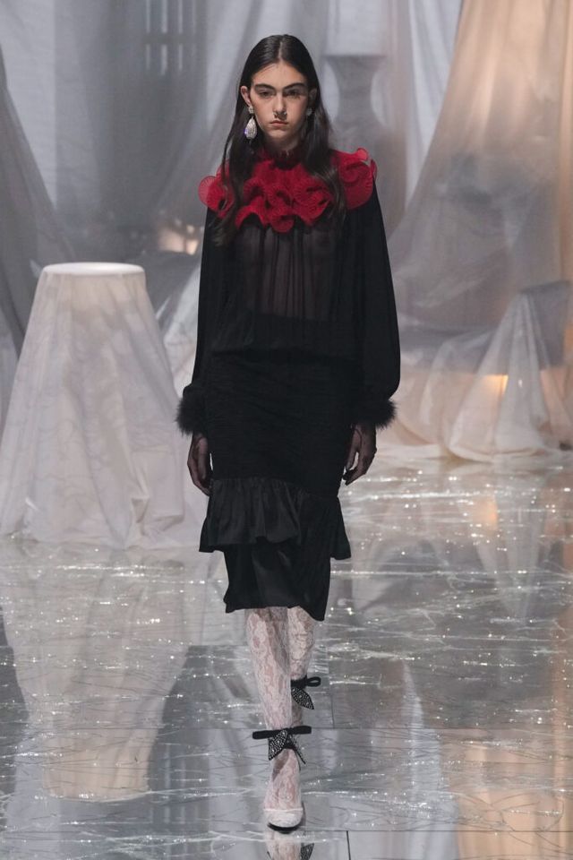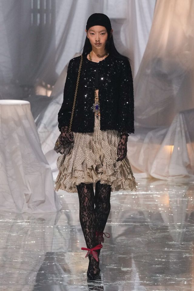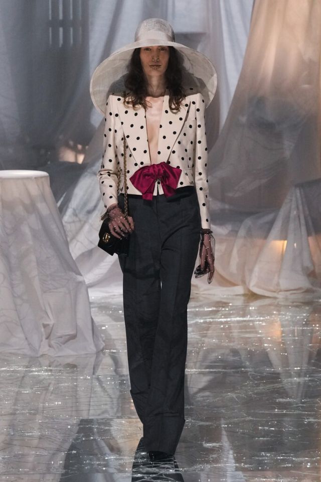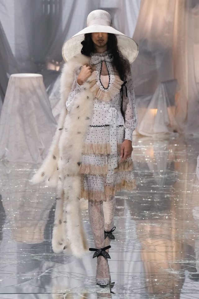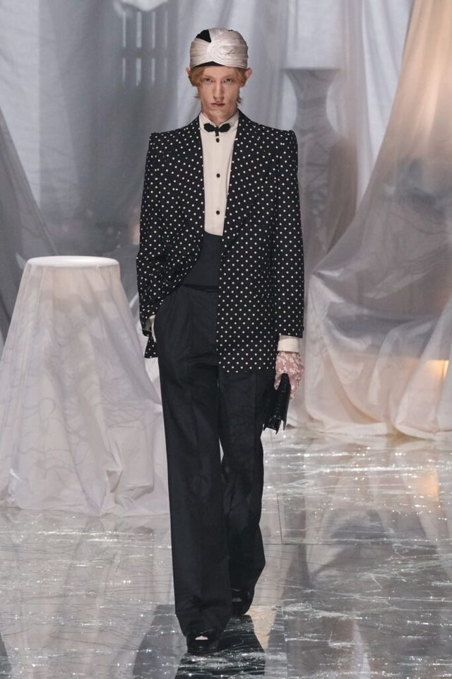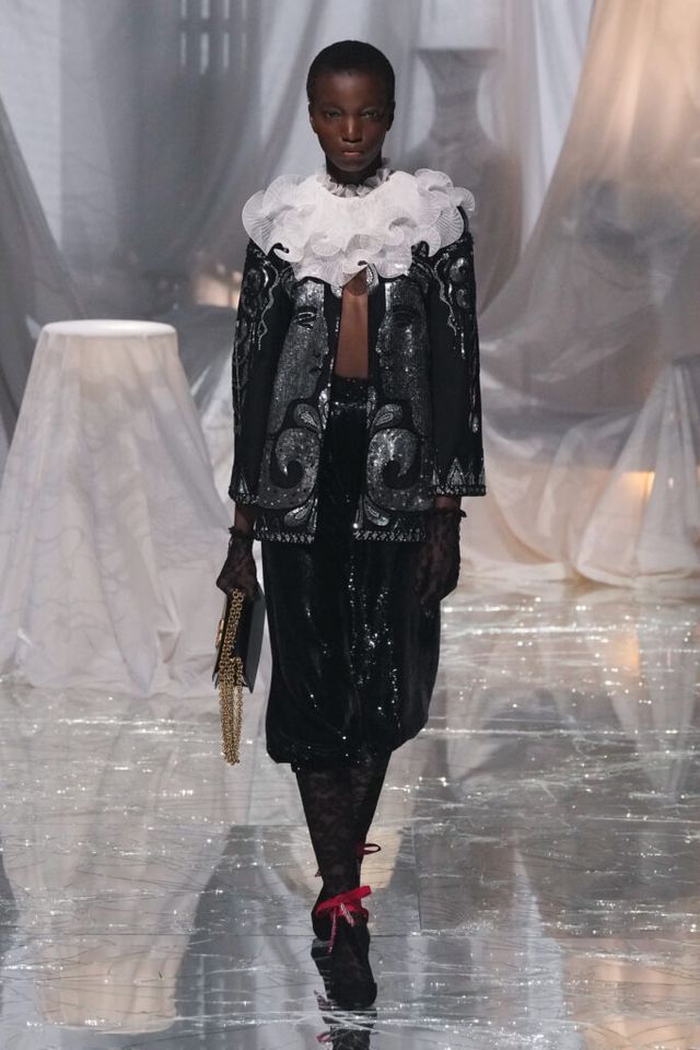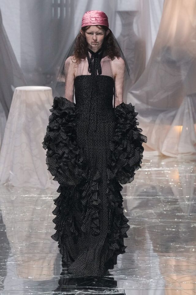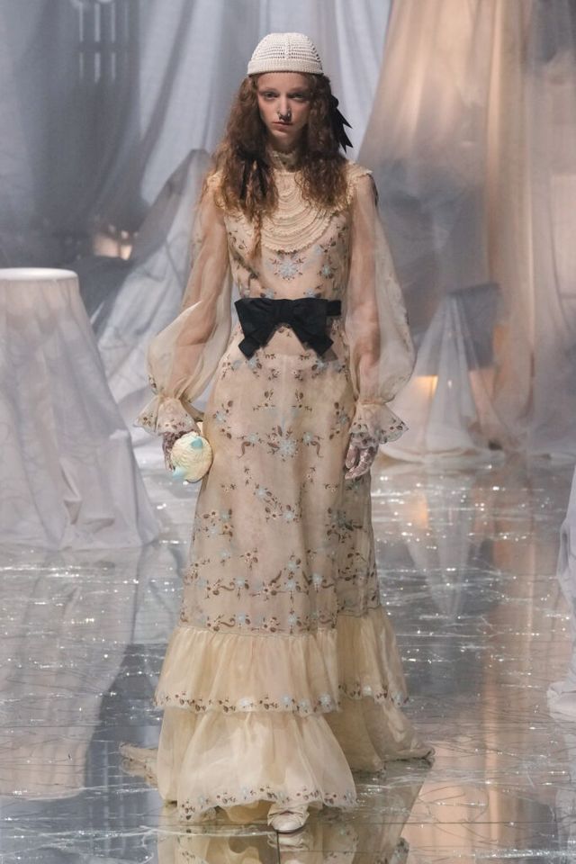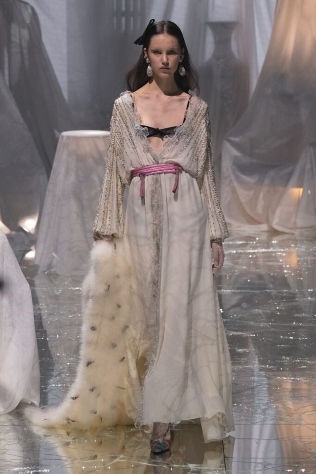 NOTE 금이 간 거울 바닥에 흰색 천으로 덮인 골동품이 가득한 공간에서 그간 관심이 집중됐던 발렌티노 2025 S/S 컬렉션이 공개됐다. “잊혀진 무언가를 찾고 있었습니다.” 알레산드로 미켈레는 발렌티노의 황금기라 평가받는 1970년대의 아카이브를 탐구했고, 이를 현대적으로 재해석한 룩들은 어느 하나 평범한 것이 없었다. 화려한 스팽글, 자수, 베일, 거대한 모자, 피어싱, 리본 등에도 그의 미감을 충실하게 담아낸 컬렉션이었다.