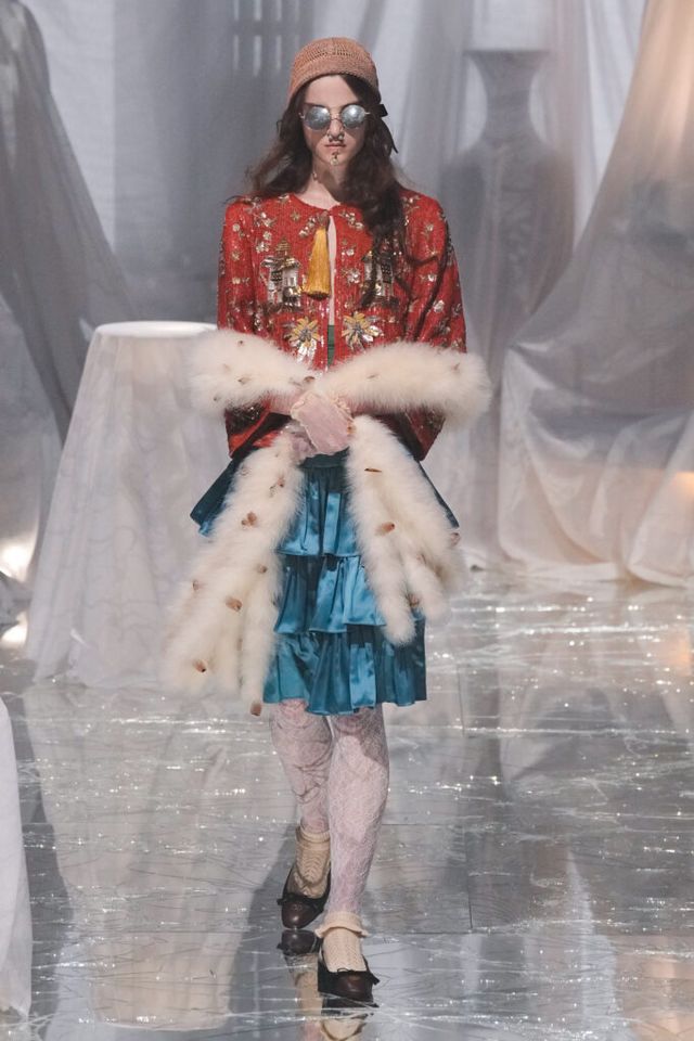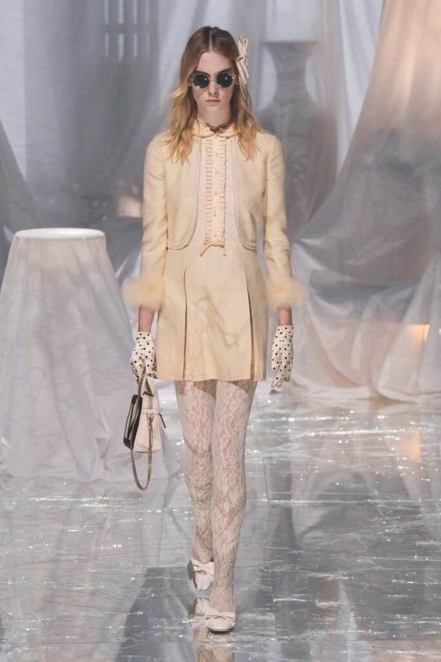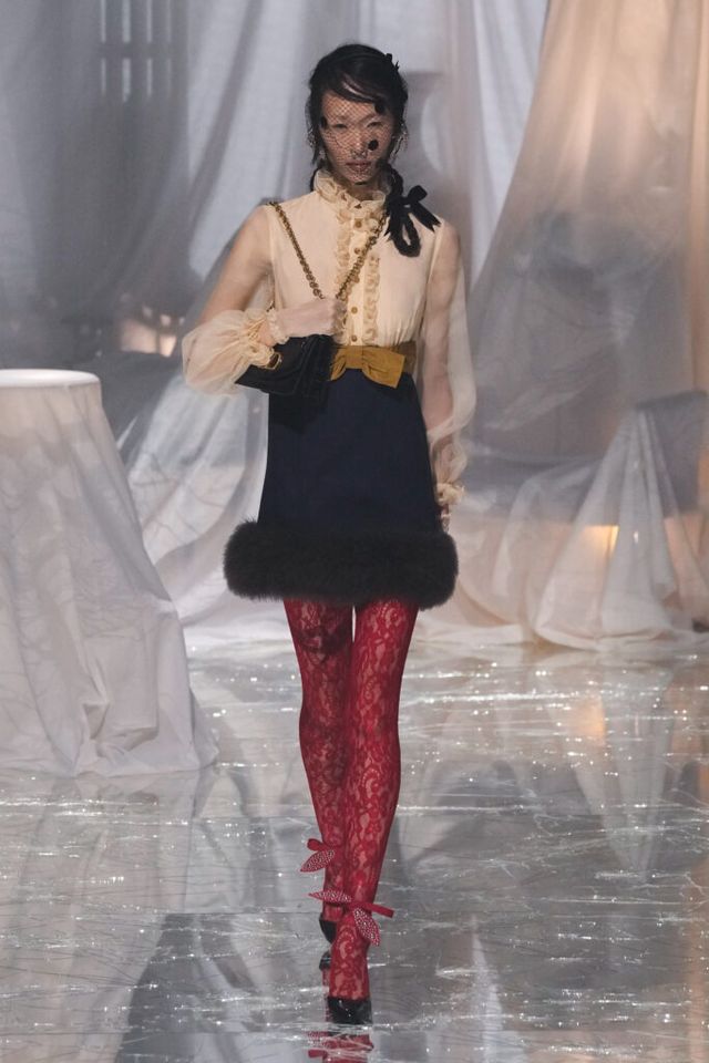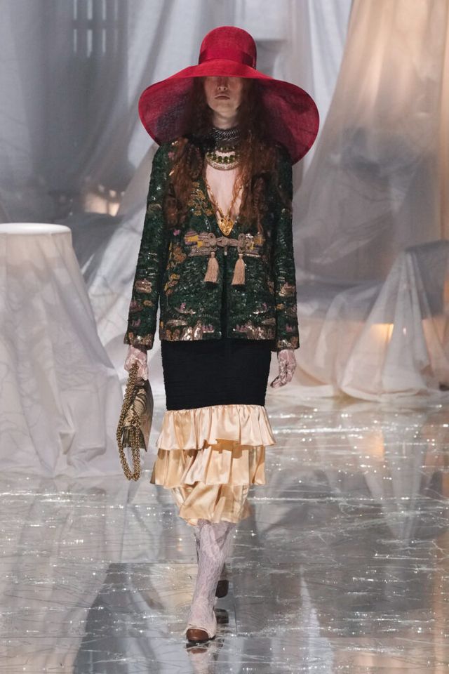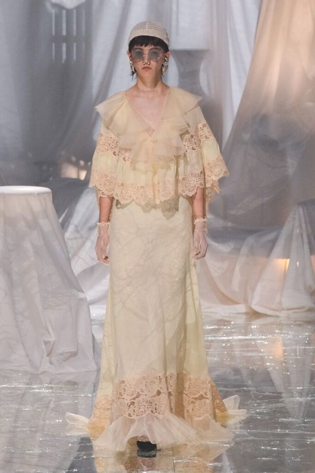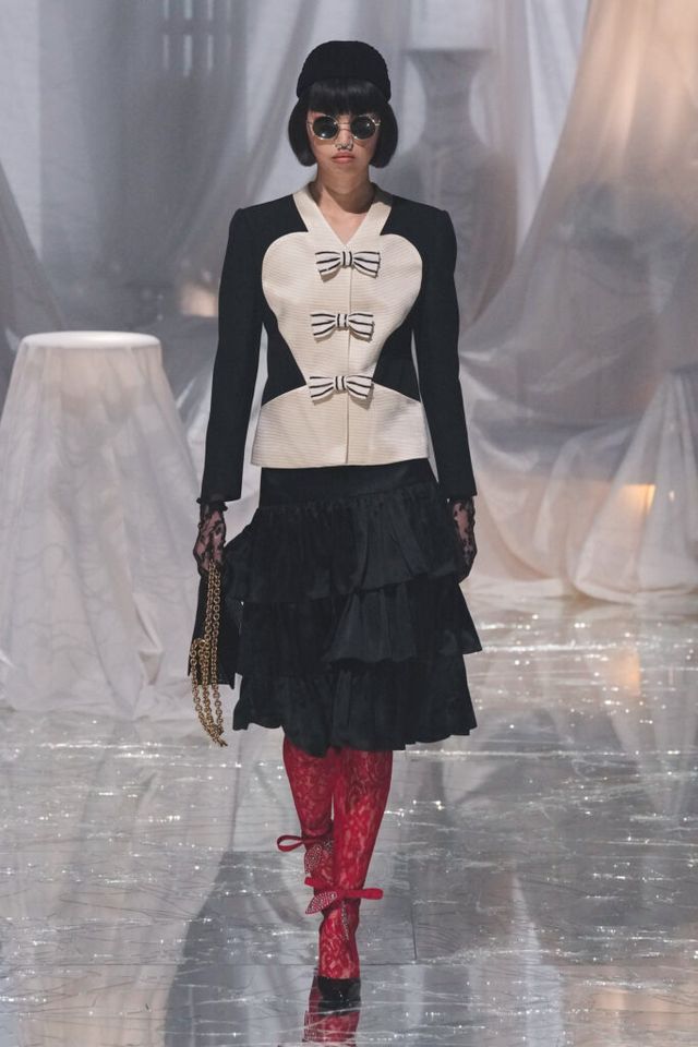FAVORITE LOOK 플로럴 패턴 드레스에 레이스 모자, 코와 입에 착용한 액세서리, 크리스털 목걸이, 레이스 장갑과 타이츠, 슬링백이 어우러진 룩. 맥시멀리즘을 사랑하는 그가 돌아왔음이 느껴지는 순간이었다.