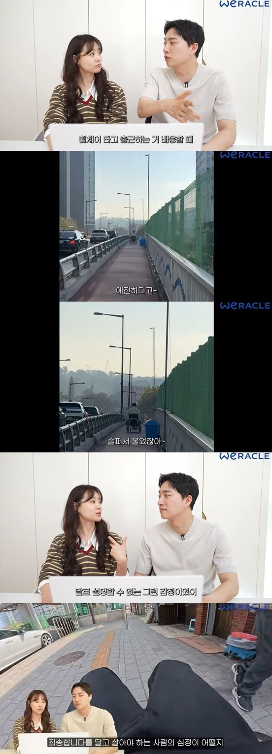 송지은은 "뭔가 그냥 힘들 것 같아서 걱정됐다. 종종 오빠가 운동 삼아서 밀어서 가고 싶다고 그럴 때가 있다. 오빠가 막 밀고 가는데 말로 설명할 수 없는 감정이었다"라며 박위의 출근길을 보고 눈물을 흘렸던 이유를 설명했다.