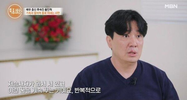 황인혁은 "25~26년 전의 일인데, 자려고 누우면 장군 혹은 저승사자가 와서 서있었다. 이런 꿈을 반복적으로 꿨다"고 떠올렸다. "사람 마치는 거다. 정신병원까지 가봤다. 죽으려고 했다. 신경안정제도 받아 먹어봤는데 부작용이 났다. 너무 괴로운 거다. 부모님한테도 죄송하고"라며 무속인이 된 이유를 털어놨다.