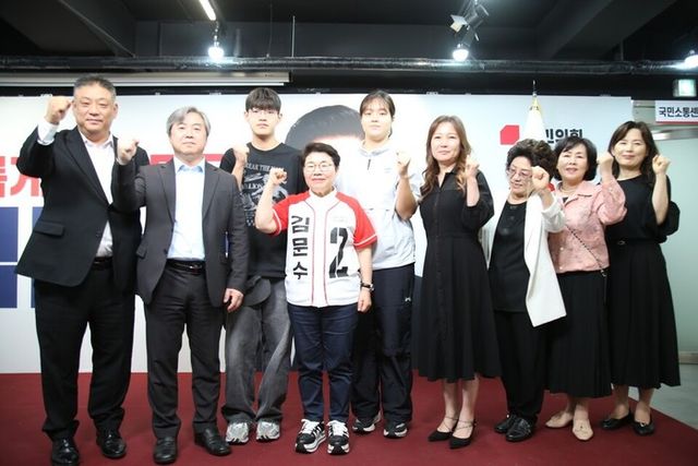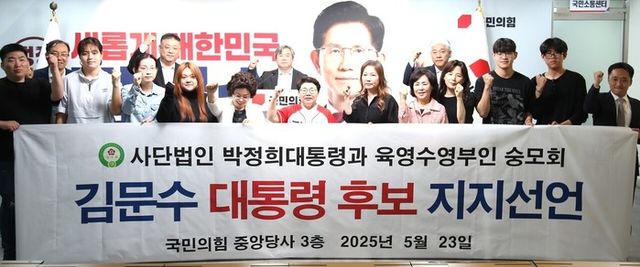 | ▲ 박정희대통령과 육영수영부인숭모회는 23일 오후 여의도 소재 국민의힘 중앙당사 3층 브리핑룸에서 임이자(사진 가운데)국회의원의 소개발언에 이어 김문수대선후보 지지선언을 뒤로 화이팅을 외치며 기념촬영을 하고 있다./중앙당사=권병창 기자 |