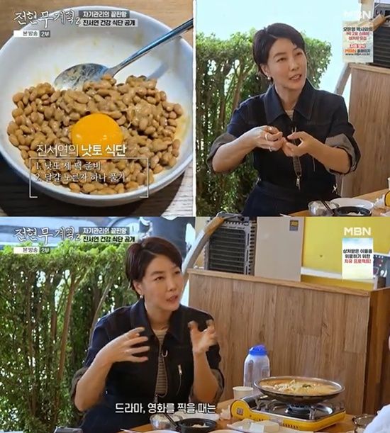 진서연은 "낫토를 밥으로 먹는다. 세 팩을 까서 계란 노른자를 넣고 신김치를 송송 썰어서 올리고 퍼먹는다"고 자신만의 건강식을 소개했다.