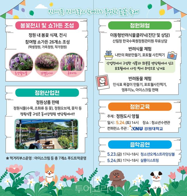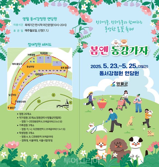 영월군이 이달 23일부터 25일까지 3일간 동서강정원 연당원에서 '봄엔 동강가자'를 주제로 봄꽃과 반려식물, 반려동물이 함께하는 특별한 봄 가든쇼를 개최한다.
