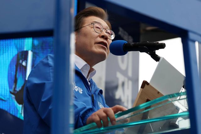 이재명 더불어민주당 대통령 후보가 지난 22일 오후 경남 양산시 양산워터파크공원에서 시민들에게 지지를 호소하고 있다. / 뉴스1