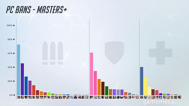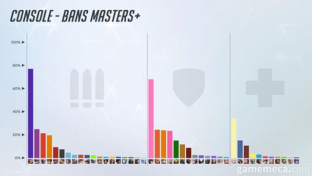 PC와 콘솔의 마스터 등급 이상 역할별 금지율도 살펴볼 수 있었다. 우선 PC 마스터 등급 이상에서는 공격은 프레야가 가장 높았고, 돌격은 D.VA, 지원은 아나가 각각 1위를 차지했다. 이어서 콘솔 마스터 등급 이상에서는 공격 1위는 솜브라이며, 돌격은 D.VA, 지원은 메르시가 1위에 올랐다. 이에 대해 제작진은 "자리야는 가장 높은 금지율을 기록한 돌격 영웅이지만 마스터 이상에서는 D.VA가 가장 높았다"라며 등급별로도 금지율에 차이가 있었다고 언급했다.