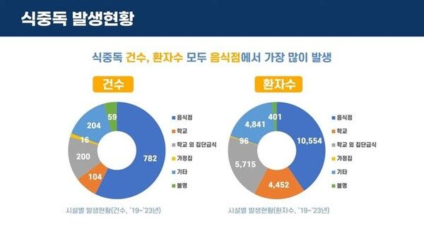 뉴시스 보도에 따르면, 24일 식품의약품안전처에 따르면 식중독은 코로나19 발생 이후 감소하다가 2021년 부터 발생 건수 및 환자 수가 증가하고 있다. 최근에는 음식점, 학교 외 집단 급식, 학교 순으로 많이 발생한 것으로 나타났다.