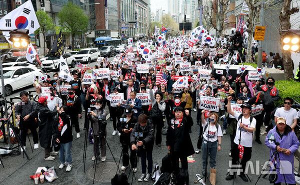 참가자들은 태극기와 성조기를 흔들며 '윤 어게인' '윤석열 대통령' 등의 구호를 외쳤다.