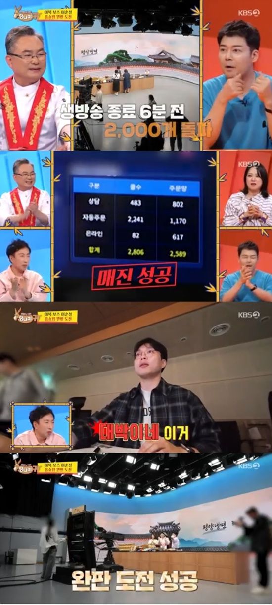 이순실은 배가 불렀지만 최선을 다해 시식을 했고 종료 6분 전 주문량이 2000개 돌파하더니 종료 직전에 2400개 완판에 성공했다.