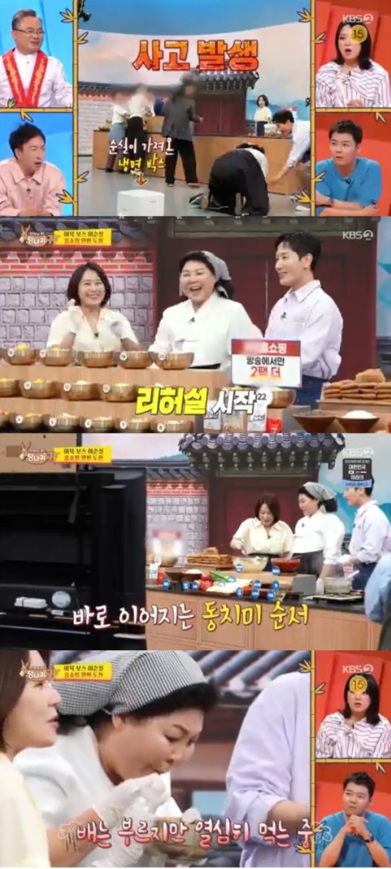 이순실은 리허설 전 자신이 가져온 냉면박스에 걸려 넘어지며 당황했다.