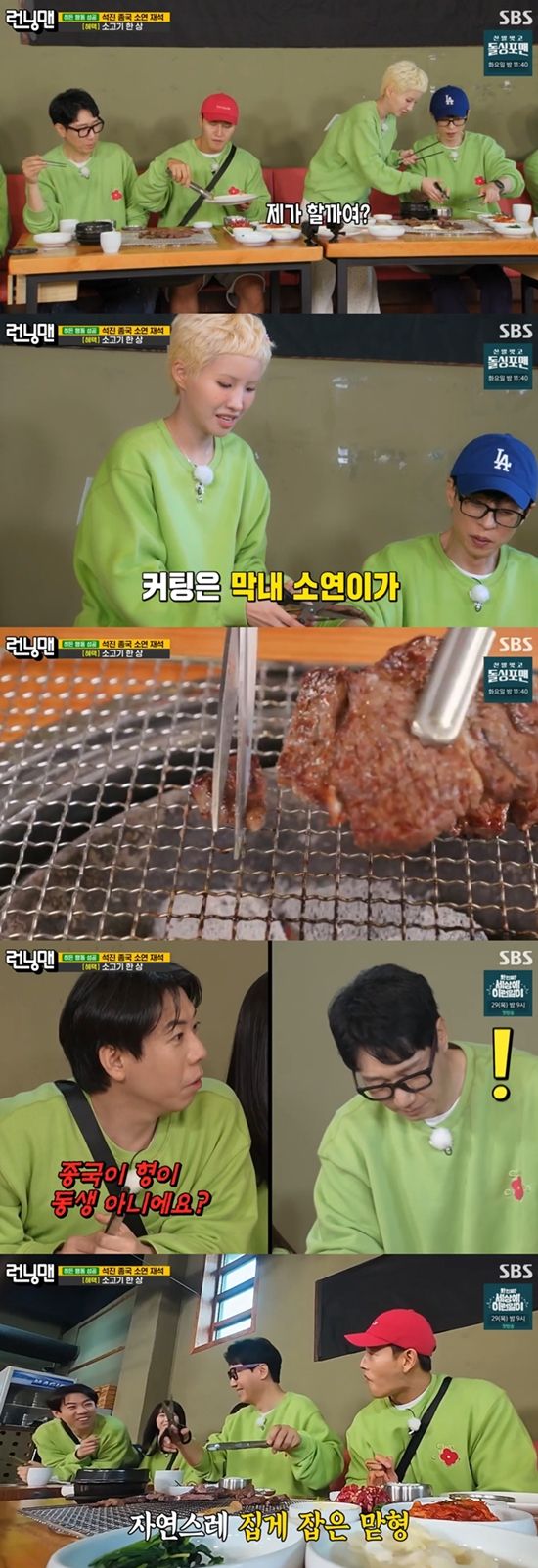 지석진이 고기를 굽고 있자 양세찬이 "석진이 형. 종국이 형이 동생 아니에요?"라고 물었다. 김종국은 "내가 초반에 (고기를) 다 깔아놨는데, 석진이형이 다 잘랐다. 맛있다. 양념이 되어 있다"고 말했다. 지석진은 "괜찮다. 이게 어버이날이다"라고 밝혔다. 소연은 고기를 먹으며 "너무 맛있다. 엄마 생각난다"고 말했다.
