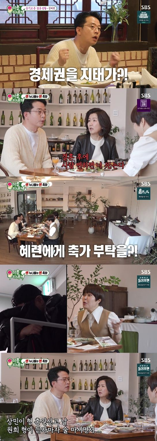 이성미는 "(임)원희는 불쌍해서 어떡하냐"라고 했고 김준호는 "상민이 형 혼인신고 날 원희 형이 듣자마자 술 마시면서 '이놈의 썩을 놈의 세상'이라고 하더라"라고 말해 웃음을 자아냈다. 그러면서 "원희 형이 상민이 형을 아래로 봤거든. 충격 먹은 거다"라고 덧붙였다.