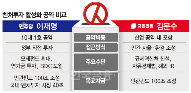 이재명 후보는 '모태펀드 확대'와 제도 개편 등 국가 주도 전략을 앞세운 반면, 김문수 후보는 '규제 타파'와 민간 중심 생태계 조성, 해외 투자 유치에 방점을 찍었다.