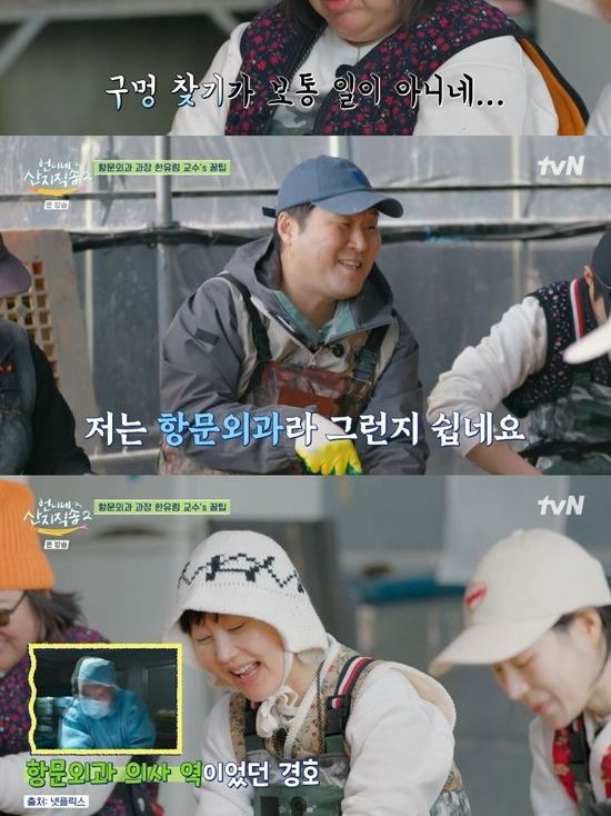 박준면이 "구멍 찾는 게 쉽지 않다. 보통 일이 아니다"라고 말했다. 이에 윤경호가 "저는 전공이 항문외과라 그런지 쉽다. 항문 쪽에 문제 있으면 (저한테) 와라"라고 말해 웃음을 자아냈다. 윤경호는 넷플릭스 드라마 '중증외상센터'에서 항문외과 의사를 연기한 바 있다.